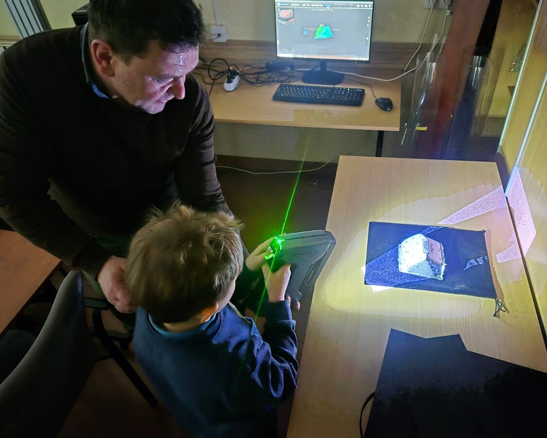 Uczestnicy samodzielnie programowali roboty, które poruszały się po wcześniej przygotowanych, kolorowych liniach. Każdy kolor odpowiadał określonej komendzie, dzięki czemu dzieci mogły obserwować, jak robot reaguje na zaprogramowane polecenia, zmienia kierunek, zatrzymuje się lub wykonuje inne zadania. Zabawa połączona z nauką pozwoliła uczestnikom lepiej zrozumieć podstawowe zasady działania algorytmów oraz logicznego myślenia. Drugim tematem realizowanym podczas zajęć było skanowanie wybranych obiektów przy użyciu skanerów 3D.