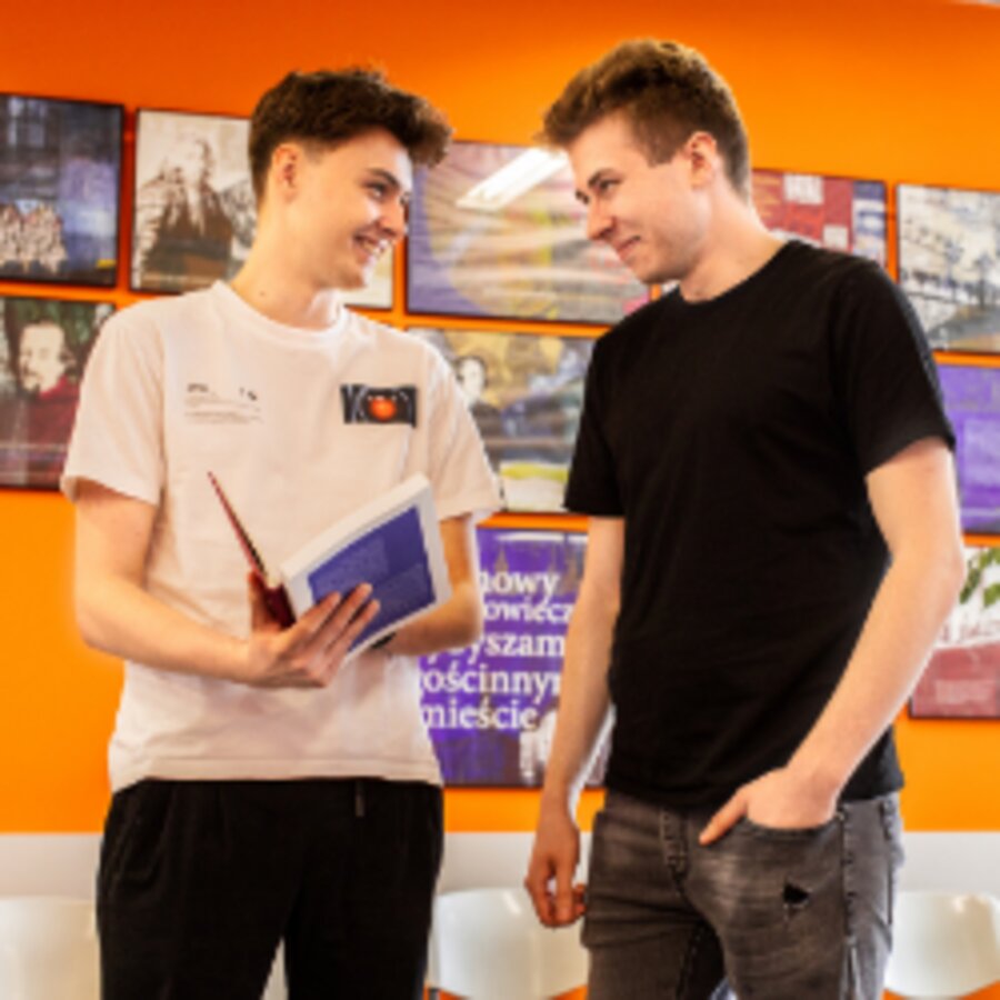 Dwóch mężczyzn stoi obok siebie. Uśmiechają się. Jeden z nich trzyma w ręku otwartą książkę.