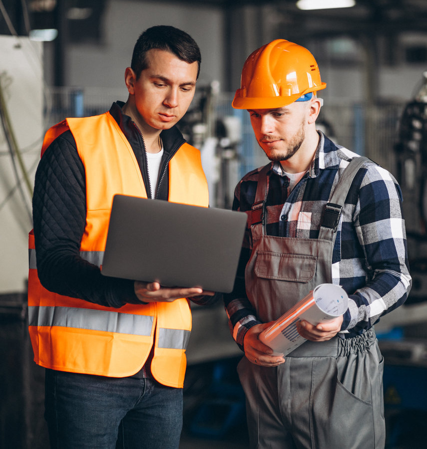 Dwóch mężczyzn. Jeden w kasku ochronnym, drugi w kamizelce odblaskowej. Stoją obok siebie.